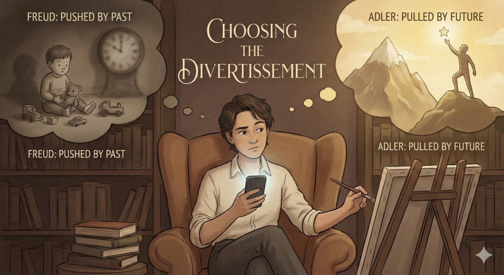 We cannot escape the need for divertissement. As Pascal said, we are fragile creatures who find silence difficult. However, we are not slaves to our past (Freud) nor are we forced to have selfish goals (Adler).